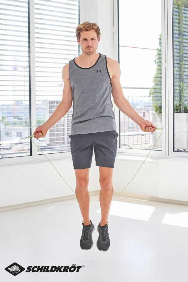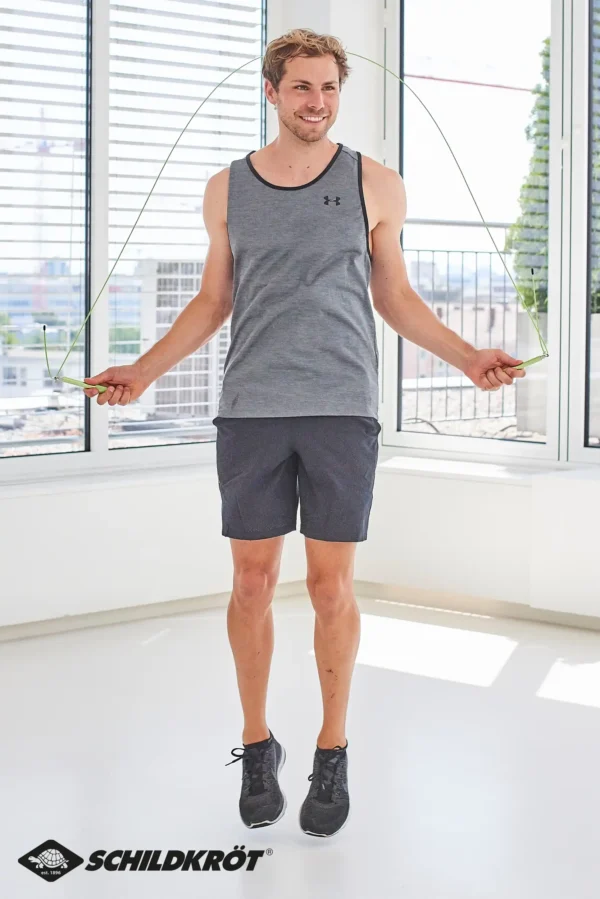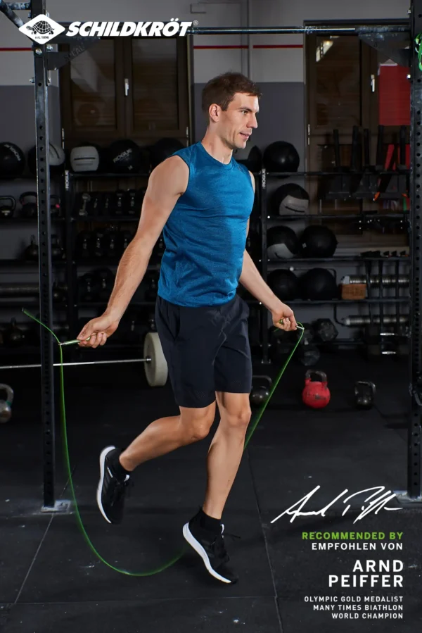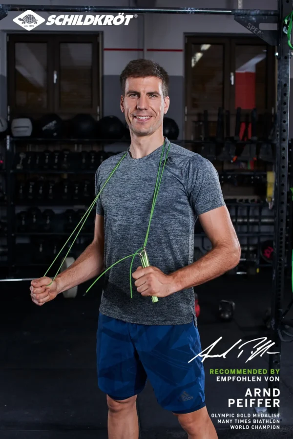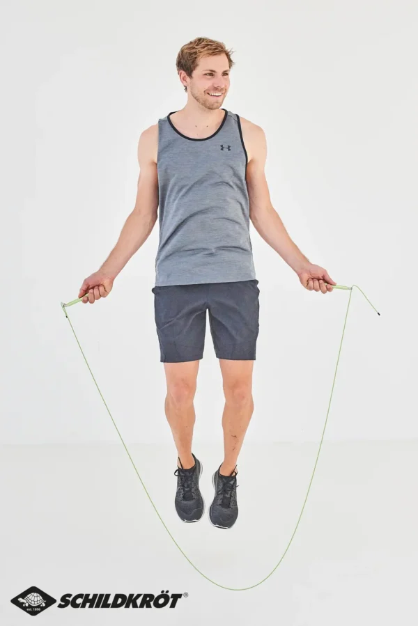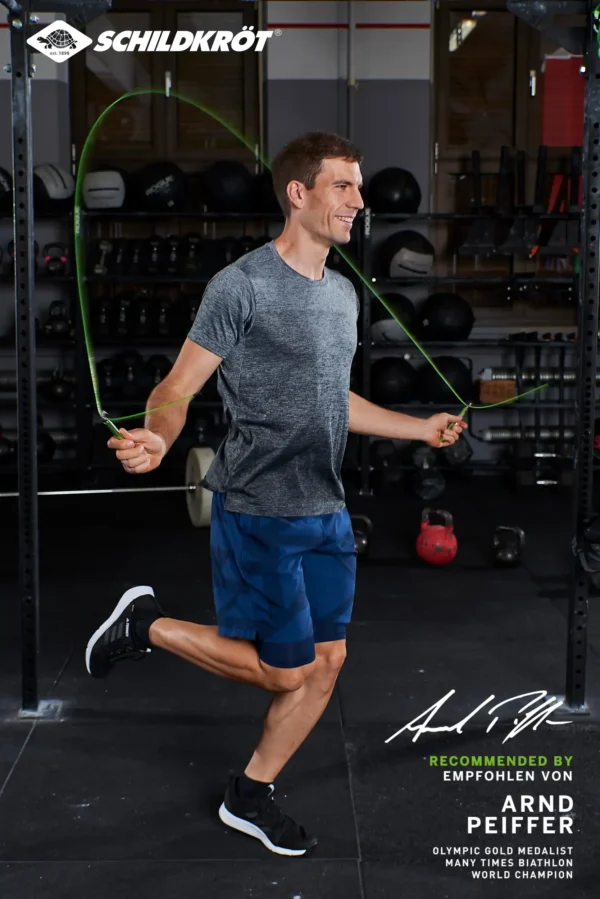Schnelldrehendes, hochflexibles und mit Kunststoff ummanteltes Stahlseil mit hochwertigen (15cm) Aluminium-Griffen (grün eloxiert). Seillänge 300cm (ø2,6mm) individuell einstellbar, geeignet für Körpergrößen bis ca. 195cm. 360° Drehgelenke an den Griffenden sorgen für schnelle gleichmäßige Rotation, inkl. Aufbewahrungstasche für unterwegs. Gewicht: 220g.Das vielseitige Fitnesssortiment der Marke Schildkröt bietet seit 2013 eine große Auswahl an Kleinfitnessgeräten für den Gebrauch zu Hause oder unterwegs. Durch den hohen Bekanntheitsgrad konnte sich Schildkröt im Fitnessbereich sehr schnell im Markt etablieren. Heute decken renommierte Fachhändler den Bereich Kleinfitnessgeräte mit Schildkröt ab. Zusätzlich wurde Schildkröt in der Rubrik ?Fitness? erst kürzlich und zum dritten Mal in Folge von den Händlern Deutschlands in der SAZ zum ?Besten Hersteller? des Jahres gekürt. 7 Jahre nach Markteinführung erneuert die deutsche Traditionsmarke in ihrem Fitness-Segment den Markenauftritt komplett und präsentiert für das Jahr 2020 ein neues, dynamisches und ansprechendes Verpackungskonzept. Der neue Look passt sich optimal an die aktuellen Trends und Marktgegebenheiten an. Im Zuge des umfassenden Marken-Relaunchs konnte Schildkröt mit Arnd Peiffer auch den derzeit erfolgreichsten deutschen Biathleten als neuen Markenbotschafter gewinnen. Der in Niedersachsen geborene Wahl-Bayer Peiffer blickt auf viele Medaillen, Olympia-Siege (u.a. Olympia-Gold im 10-km-Sprint 2018 in Pyeongchang) und Weltmeister-Titel zurück. Für seine Leistungen in der Saison 2018/19 wurde der amtierende Weltmeister außerdem mit dem Goldenen Ski ausgezeichnet, der als höchste Auszeichnung unter den deutschen Ski-Sportlern gilt. Schildkröt bietet eine Vielzahl von Trainingsmethoden und Anweisungen für seine Fitness Produkte. Scannen Sie den QR-Code auf der Verpackung oder besuchen Sie unsere Website, um Tipps und Schulungsvideos zu erhalten.