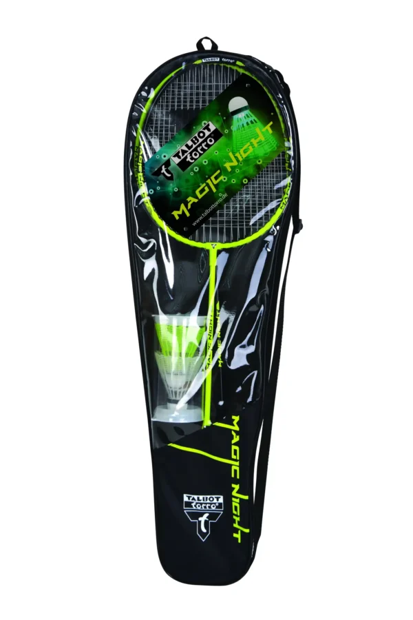Der besondere Federball-Freizeitspaß von Talbot-Torro ist das neue Magic Night Set. Mit diesem Set können Sie Federball ab sofort auch bei Nacht spielen! Das Set besteht aus zwei robusten Schlägern mit hart bespannter, multifiler Saite. Das absolute Highlight in diesem Set sind die neu entwickelten LED-Federbälle; robuste Kunststofffederbälle, die auf Innenseite einen Schalter für die LED-Beleuchtung haben. Im Lieferumfang enthalten ist jeweils ein weißer Ball, der grün leuchtet sowie ein gelber Federball, der die Nacht rot erleuchten lässt. Die Brenndauer beträgt jeweils circa 48 Stunden. Die LED-Bälle sind mit einer CR927 Batterie ausgestattet. Die Batterie ist nicht austauschbar. Bitte nicht im Hausmüll entsorgen. Das Nylon-Carrybag passt nicht nur perfekt zur Schlägeroptik, sondern ist vor allem praktisch für den Urlaub am Strand, im Garten oder im Park. Nominiert zum "Top 10 Spielzeug" 2019. Hier empfehlen wir Ihnen die 3er Dose Magic Night Federbälle - Artikelnummer: 479123. Talbot-Torro wurde u.a. von dem Britischen Badminton-Champion Derek Talbot gegründet, der sich nach seiner aktiven Zeit als Spieler sehr stark engagierte, dass Badminton olympisch wurde. Talbot-Torro ist heute klarer Marktführer im Freizeit-Badminton-Segment in Zentraleuropa und bietet ein exzellentes Preis-Leistungs-Verhältnis.