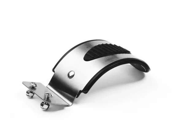 Das Bremsblech aus schwarzem Kunststoff mit genieteter Blattbremsfeder wird an der metallenen Montageplatte mit den beiden Schrauben befestigt. Montageplatte und Schrauben inklusive.