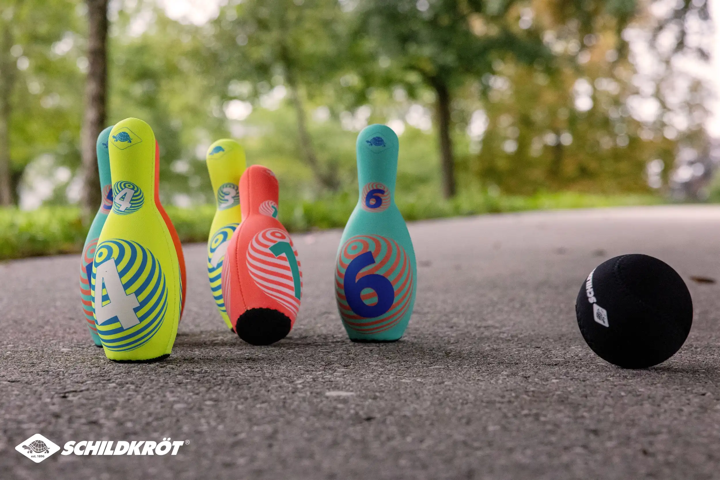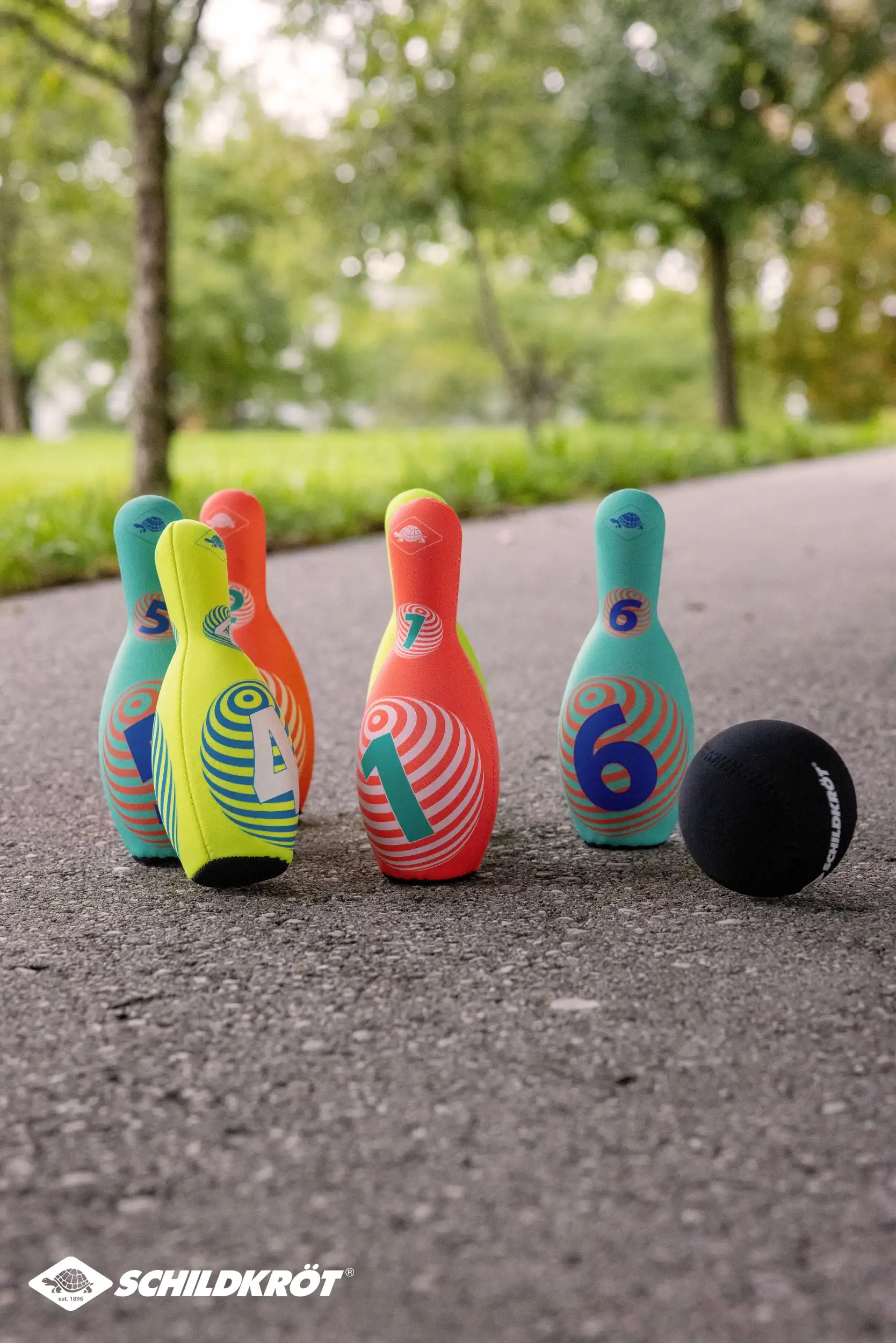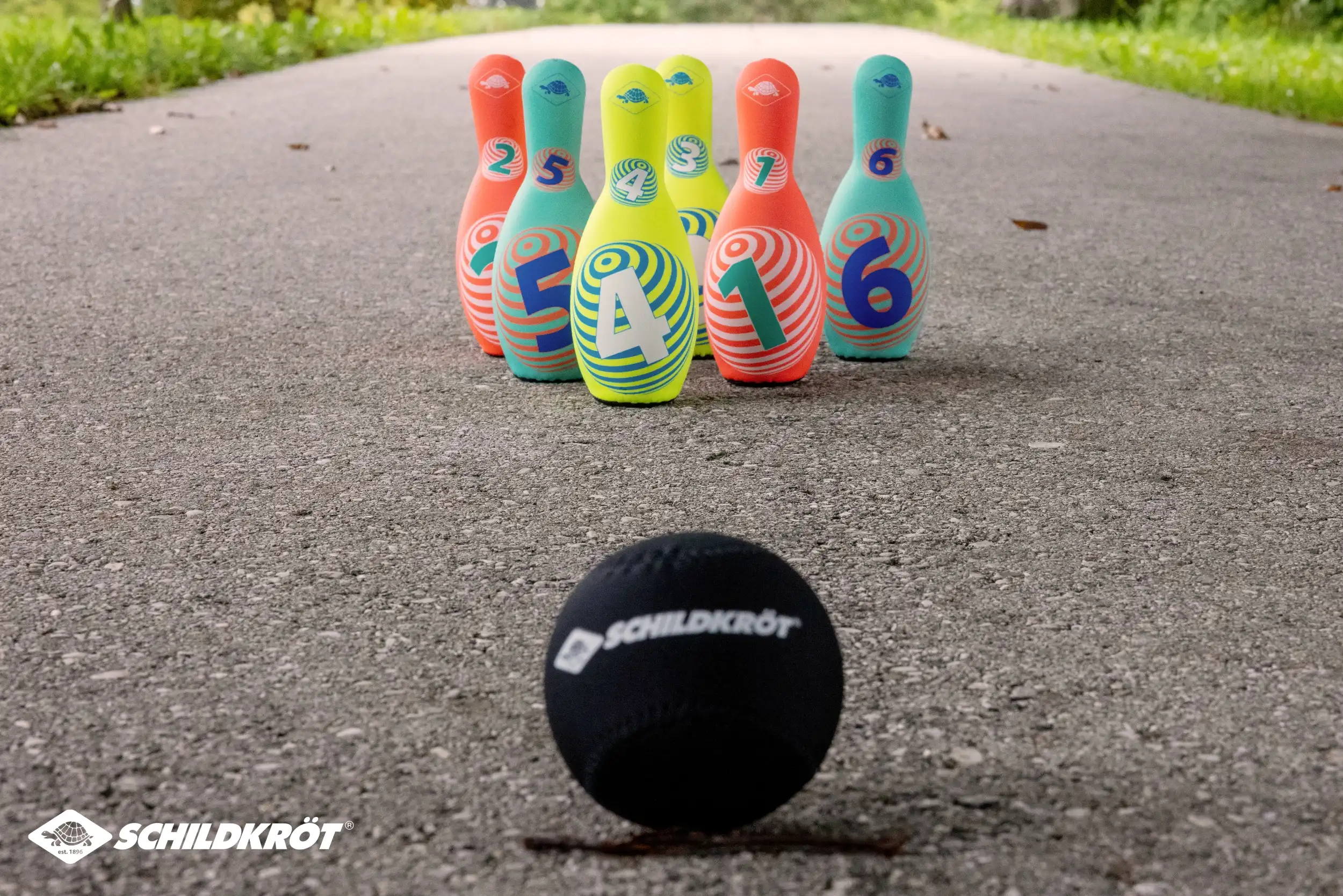 Das sehr beliebte Neopren-Kegelset aus dem Hause Schildkröt im neuen Design ist die spielende Heranführung an das Thema Kegeln. Die leichten, mit griffigem Neopren ummantelten Kegel (21,5 x 8 cm) haben eine ausreichend große Standfläche und stehen gut. Der hohle Kunststoffkern ist ein idealer Kompromiss bzgl. des Gewichtes. Zu leicht, bleiben die Kegel nicht stehen, zu schwer ist es nichts für die Kids! Im Set sind 6 Kegel in 3 verschiedenen Farbstellungen. Mit dabei ist außerdem eine "Kugel" ebenfalls aus Kunststoff und Neopren-ummantelt. Alle Teile passen in die beiliegende, wiederverschließbare Netztasche. So bleibt alles zusammen und man hat beim nächsten Spiel sofort wieder alle Teile zur Hand. Alle Teile sind salzwasserfest; auch einem Spiel am Sandstrand steht also nichts im Wege. Das weiche, leichte, wasserfeste Kegelset ist der ideale Begleiter für Pausenhof, Garten, Wohnzimmer, Schule, Park, Garten. Ideal für Jung und Alt. ACHTUNG! Verpackung vor Abgabe des Produktes an Kinder vollständig entfernen. Über Schildkröt: Die über 100 Jahre alte deutsche Marke Schildkröt gilt als Erfinder des Tischtennisballs. Heute bietet Schildkröt neben Tischtennis auch eine sehr umfangreiche Funsport-, Rollsport- und Fitness-Kollektion an und gilt in gewissen Bereichen als Marktführer. Die Produktentwicklung erfolgt ausnahmslos in Deutschland. Die weltweiten Produktionsstätten werden streng überwacht und genügen höchsten Sozialstandards.