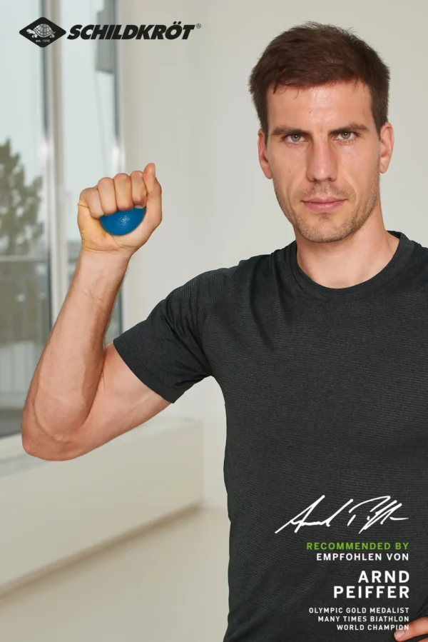 Die Schildkröt Fitness Anti-Stress Therapie Bälle im praktischen 2er Pack eignen sich ideal um die Hand- und Unterarmmuskulatur zu stärken, Fingerfertigkeit zu steigern und Stress zu reduzieren. Sie fördern die Handbeweglichkeit und regen die Blutzirkulation an. Die handliche Größe der Therapiebälle (Ø48mm), die rutschfeste Oberflächenstruktur sowie das geringe Gewicht (ca.48g) eignen sich perfekt für den täglichen Gebrauch ob zu Hause, im Büro oder im Urlaub. Die zwei Bälle bestehen aus elastischem TPR (Thermoplastic Rubber) und haben den Härtegrad Medium. Das einzigartige Material ist langlebig, formstabil und leicht abwaschbar. Das vielseitige Fitnesssortiment der Marke Schildkröt bietet seit 2013 eine große Auswahl an Kleinfitnessgeräten für den Gebrauch zu Hause oder unterwegs. Durch den hohen Bekanntheitsgrad konnte sich Schildkröt im Fitnessbereich sehr schnell im Markt etablieren. Heute decken renommierte Fachhändler den Bereich Kleinfitnessgeräte mit Schildkröt ab. Zusätzlich wurde Schildkröt in der Rubrik „Fitness“ erst kürzlich und zum dritten Mal in Folge von den Händlern Deutschlands in der SAZ zum „Besten Hersteller“ des Jahres gekürt. 7 Jahre nach Markteinführung erneuert die deutsche Traditionsmarke in ihrem Fitness-Segment den Markenauftritt komplett und präsentiert für das Jahr 2020 ein neues, dynamisches und ansprechendes Verpackungskonzept. Der neue Look passt sich optimal an die aktuellen Trends und Marktgegebenheiten an. Im Zuge des umfassenden Marken-Relaunchs konnte Schildkröt mit Arnd Peiffer auch den derzeit erfolgreichsten deutschen Biathleten als neuen Markenbotschafter gewinnen. Der in Niedersachsen geborene Wahl-Bayer Peiffer blickt auf viele Medaillen, Olympia-Siege (u.a. Olympia-Gold im 10-km-Sprint 2018 in Pyeongchang) und Weltmeister-Titel zurück. Für seine Leistungen in der Saison 2018/19 wurde der amtierende Weltmeister außerdem mit dem Goldenen Ski ausgezeichnet, der als höchste Auszeichnung unter den deutschen Ski-Sportlern gilt. Schildkröt bietet eine Vielzahl von Trainingsmethoden und Anweisungen für seine Fitness Produkte. Scannen Sie den QR-Code auf der Verpackung oder besuchen Sie unsere Website, um Tipps und Schulungsvideos zu erhalten.