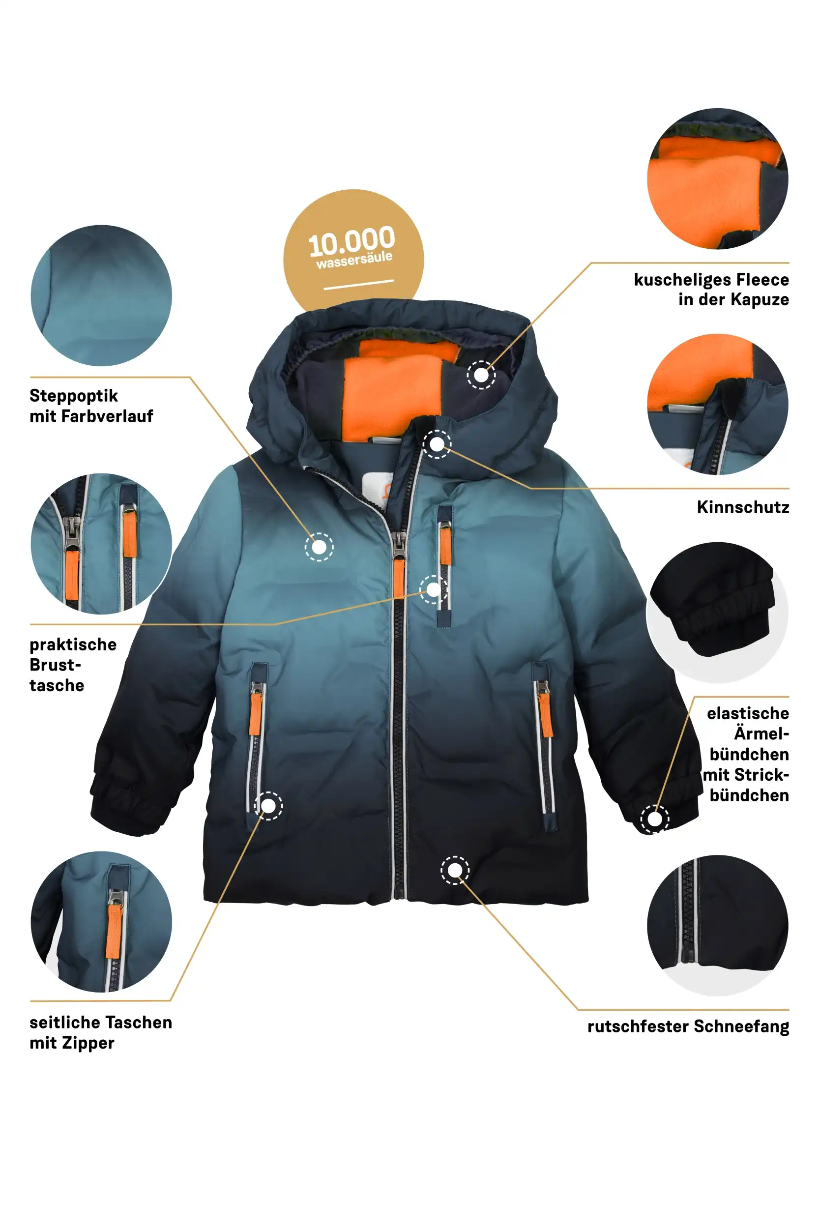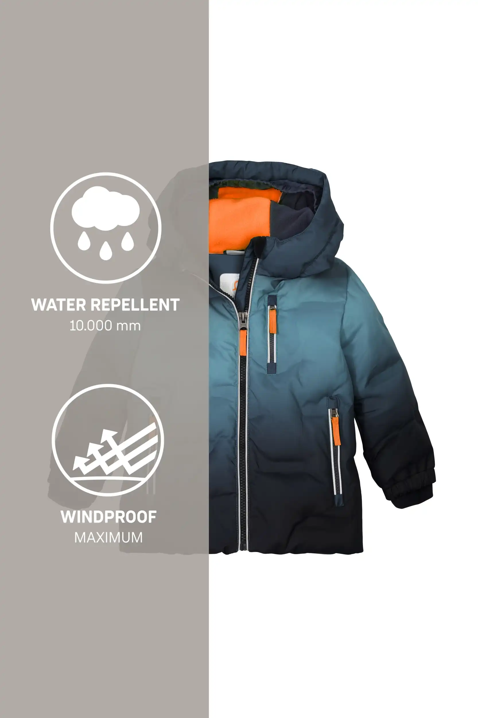 - 10.000 mm Wassersäule, wasserabweisend, winddicht