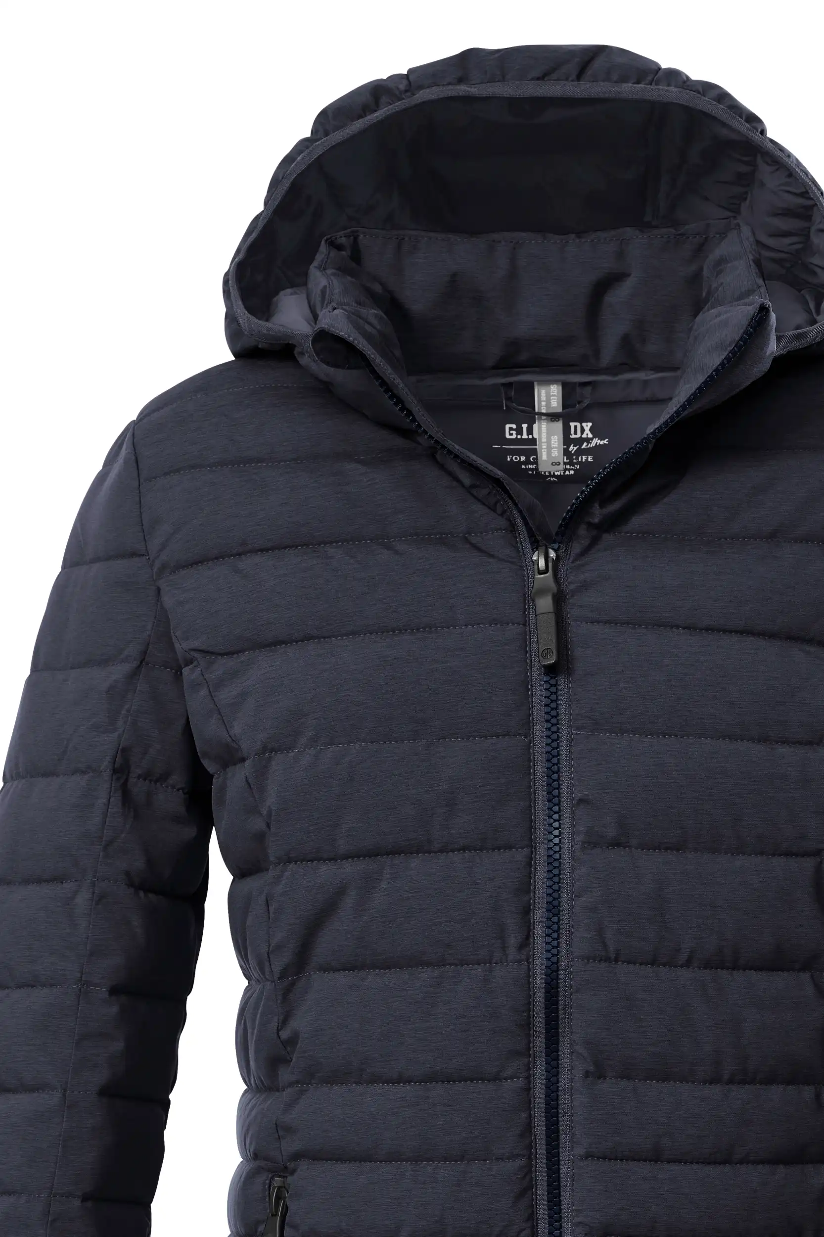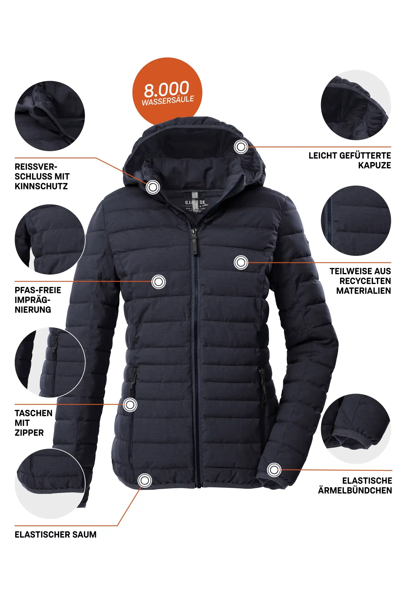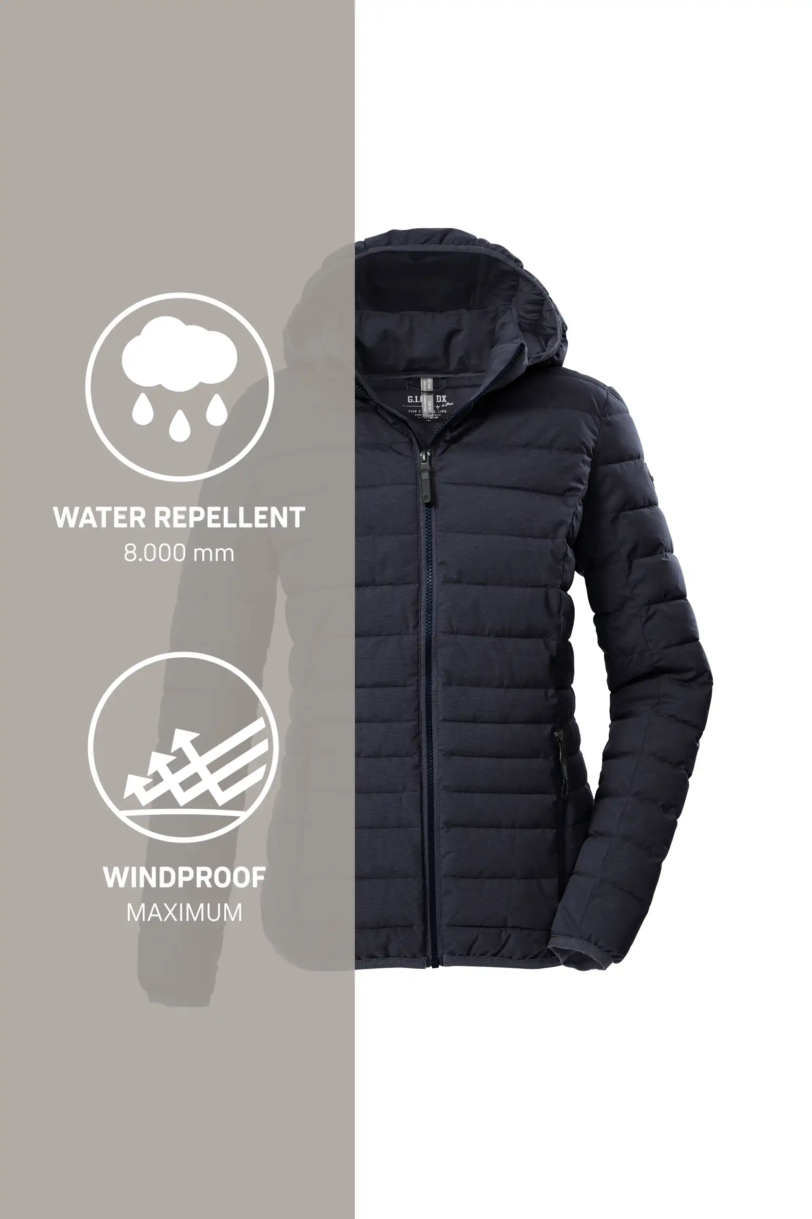 Die schmal geschnittene Damen Steppjacke in zeitlosem Citystyle von G.I.G.A. DX ist wind- und wasserabweisend mit einer 8.000 mm Wassersäule. Durch die leichte Füllung ist sie ideal für die Übergangszeit und den Herbst geeignet. Die Kapuze schützt bei Wind und Wetter. Der Saum und die Ärmelbündchen sind elastisch und sorgen so für einen guten Sitz. Die beiden Seitentaschen sind durch Zipper verschließbar, sodass nichts verloren geht. Der Frontreißverschluss ist mit einem praktischen Kinnschutz versehen. Diese Jacke wurde PFAS-frei imprägniert und teilweise aus recycelten Materialien hergestellt.