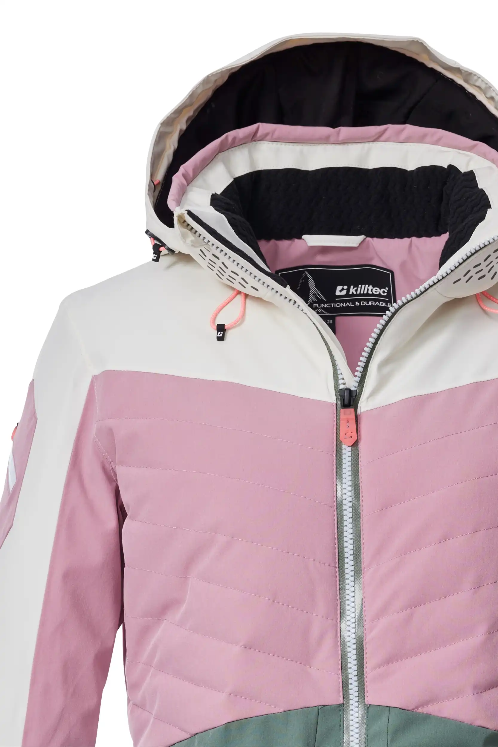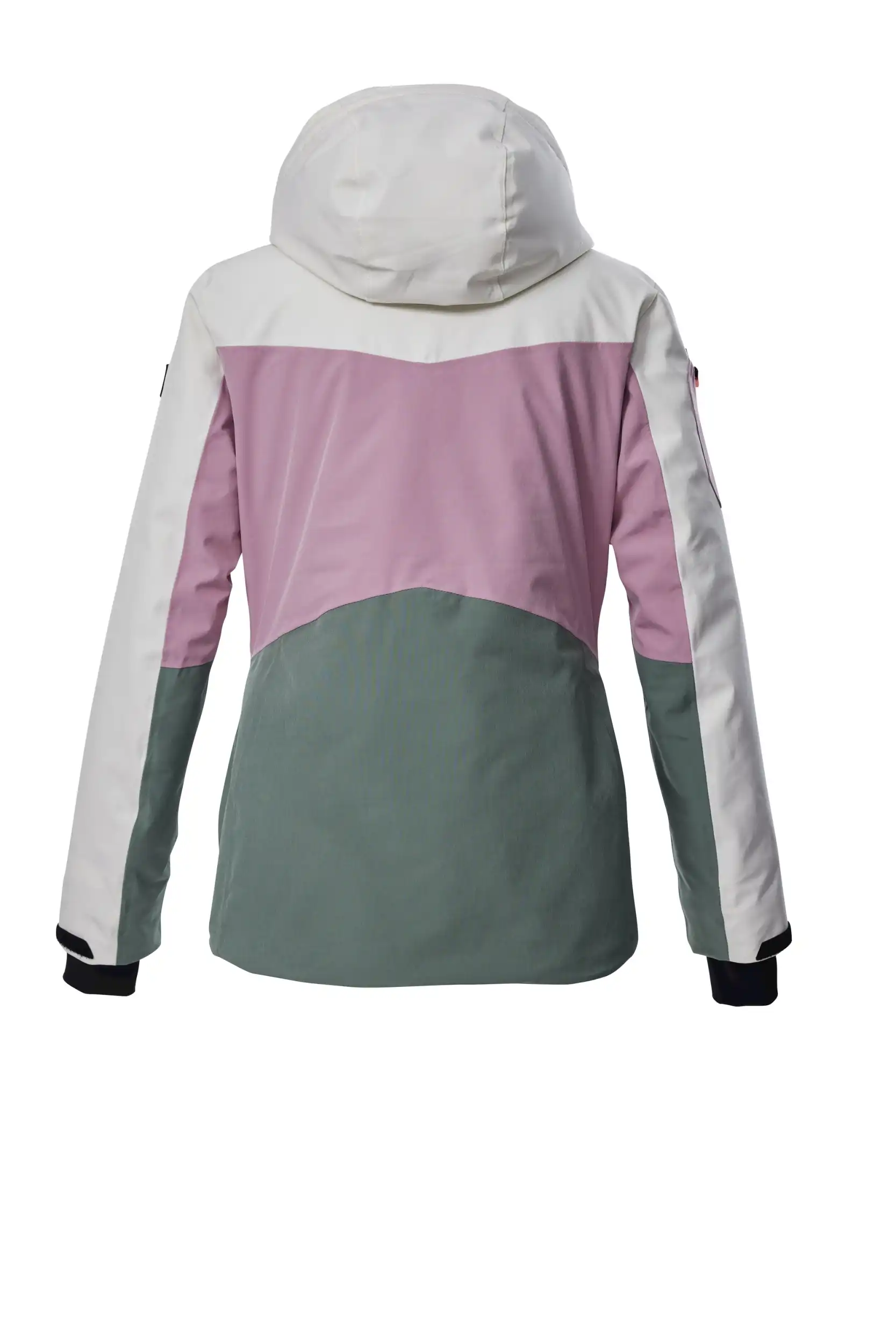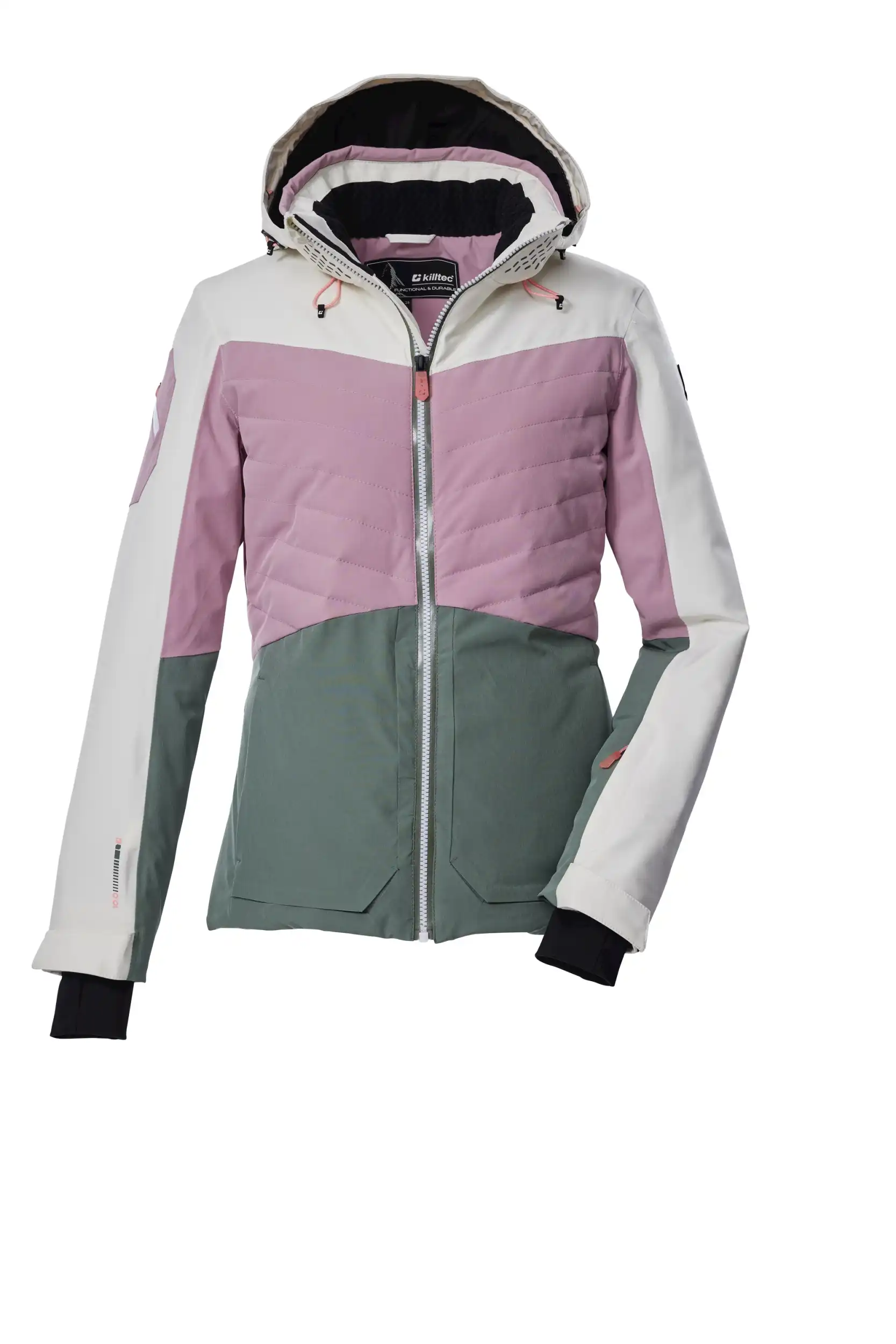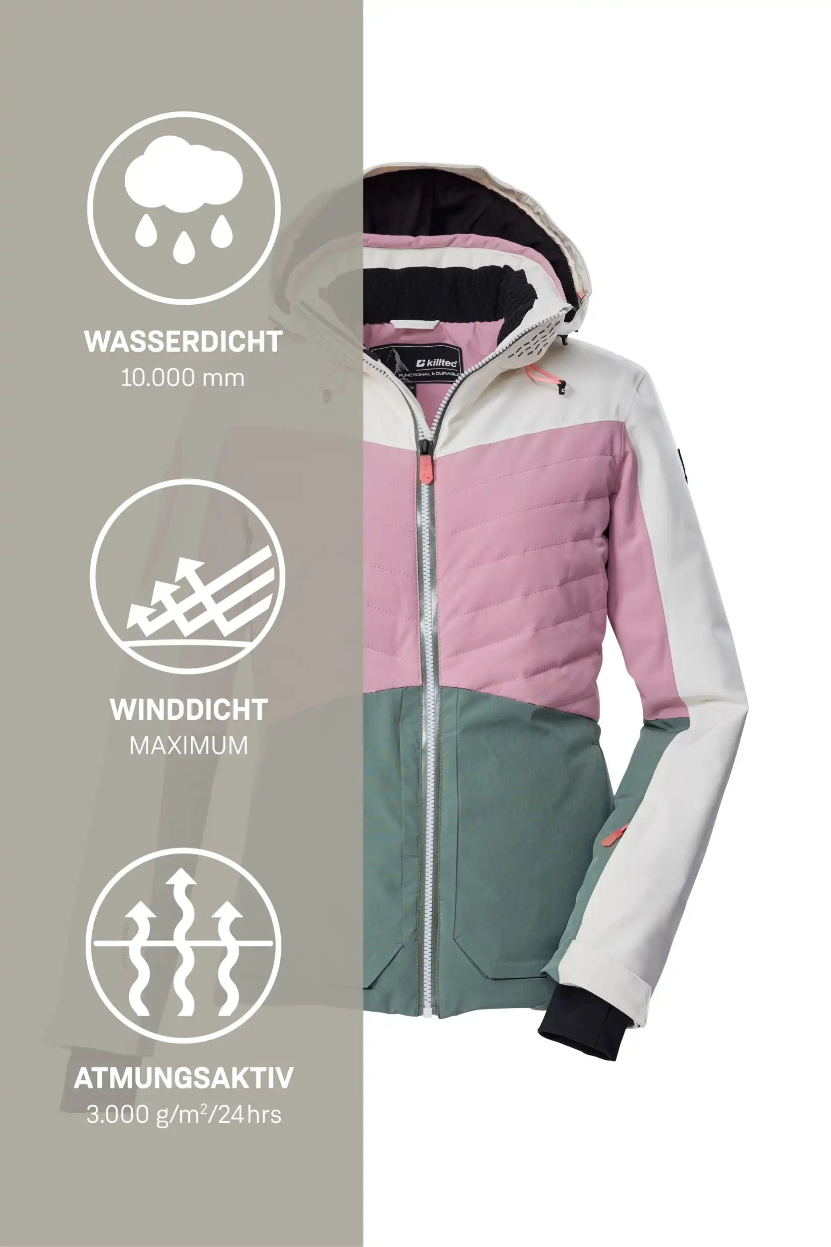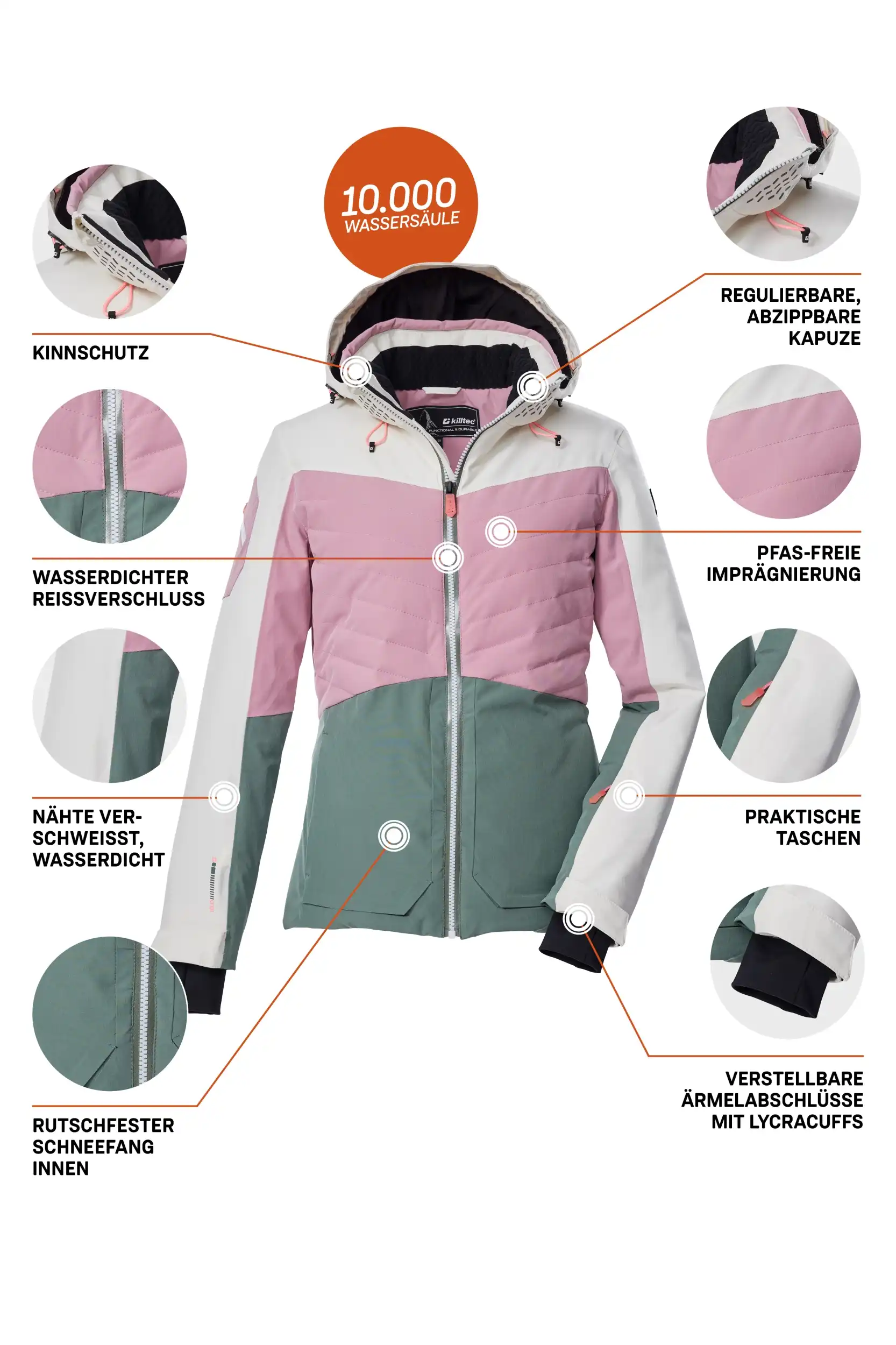 Die Damen Skijacke von killtec verbindet angesagtes Colourblock Design mit pistentauglichen Features. Sie ist wasser- und winddicht mit einer Wassersäule von 10.000 mm und alle kritischen Nähte sind verschweißt (Unser Tipp: ab und zu sollte die Jacke neu imprägniert werden). Gleichzeitig ist sie atmungsaktiv mit einer Wasserdampfdurchlässigkeit von 3.000 g/m²/24 h. Innen ist die Jacke mit einem rutschfesten, gummierten Schneefang, einer Skibrillen- sowie einer Handytasche ausgestattet. Außen biten vier Zippertaschen weiteren Stauraum. Die Weite der abzippbaren Kapuze und des Saumes lässt sich regulieren. Der wasserdichte Reißverschluss hat einen Kinnschutz, der vor dem Einklemmen der Haut schützt. Lycracuffs mit Daumenlöchern an den verstellbaren Ärmelabschlüssen verhindern das Eindringen von Kälte und Wind. Diese Jacke wurde PFAS-frei imprägniert und teilweise aus recyceltem Material hergestellt.