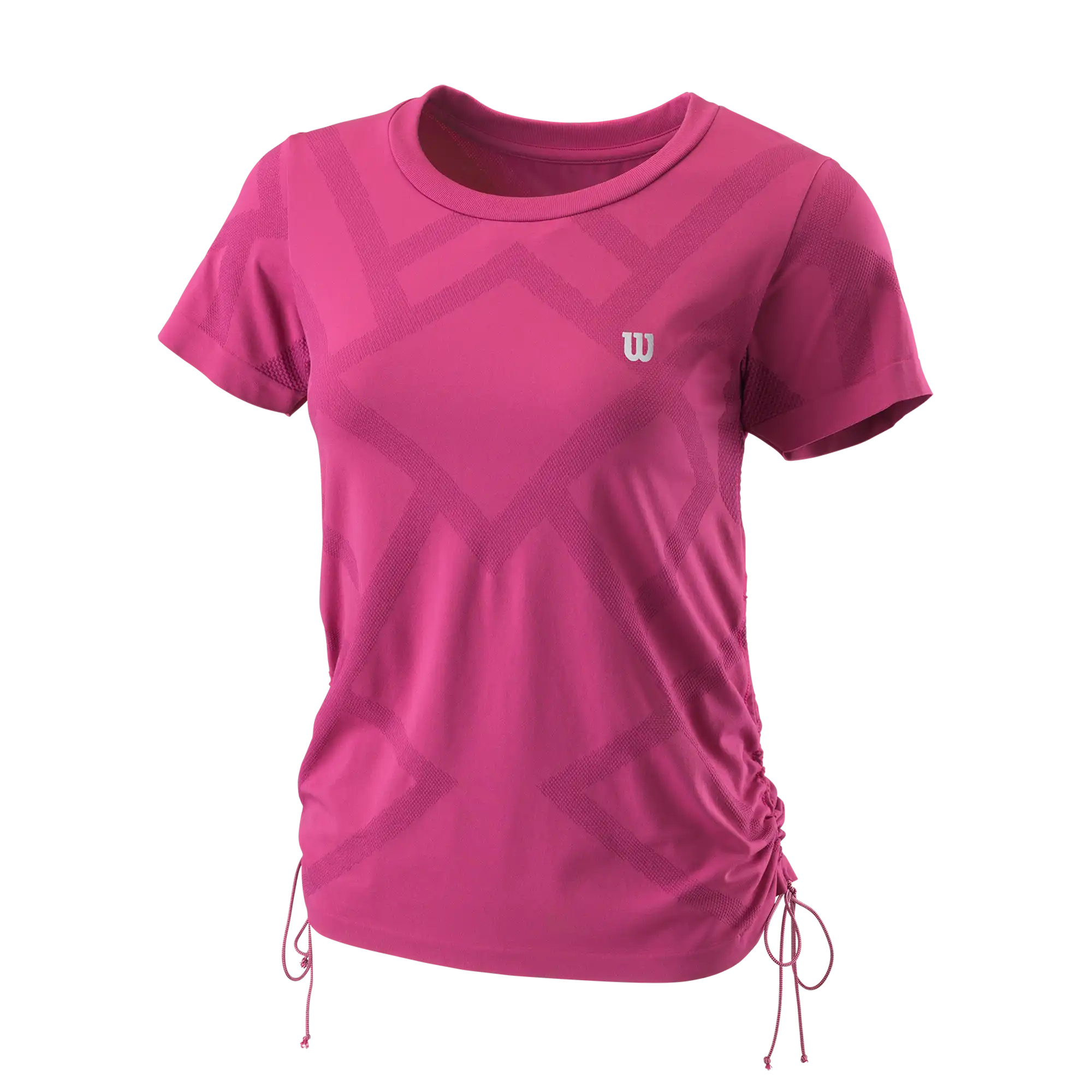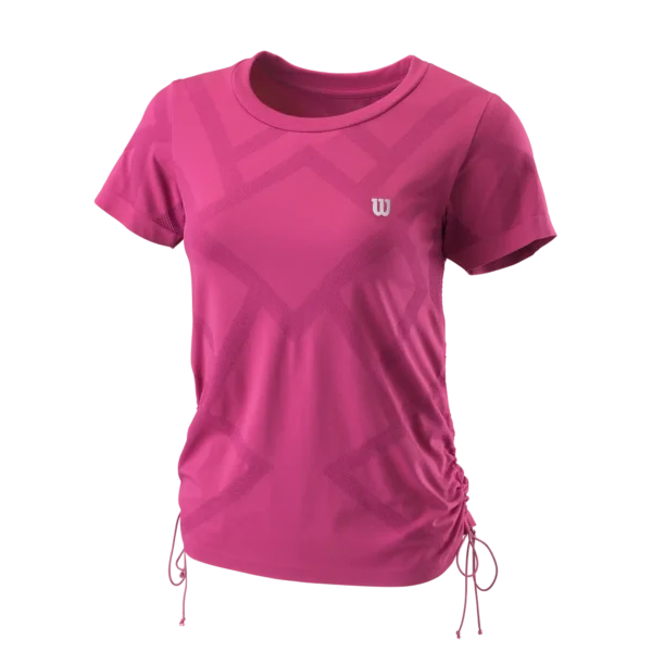 Maximieren Sie Ihre Explosivität mit einem Hauch von modernem Flair des Power Seamless T-Shirt II mit Rundhalsausschnitt in einem angepassten, leistungsfähigen und weichen Strick mit Überzug und Kordelzug an den Seiten zur Anpassung und Rüschen. Die Gewebekonstruktion aus Nylon und Polyester verfügt über eine Reihe beneidenswerter Eigenschaften: nachhaltige Geruchskontrolltechnologie, moderner Mesh-Belüftung, Feuchtigkeitsverteilungs-Technologie und einem nahtlosen Körper für abriebfreien Komfort. Das Oberteil passt perfekt zu Wilsons Power Seamless 12,5?-(31,8-cm)-Rock II.