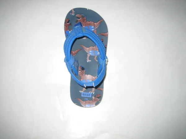 Die Reef AHI Blue T Rex Jungen Flip Flops haben eine rutschfeste Sohle, der Zehensteg ist aus Textil, der Schuh ist in sommerlichen Farben.