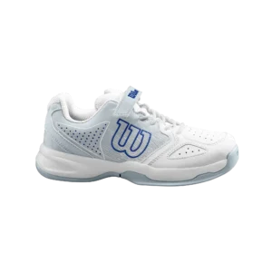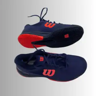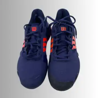Der Wilson Rush Pro 2,5 Clay Tennisschuh ist in blau rot mit All-Court Sohle, atmungsaktiv, perfekte Dämpfung, symetrisches Fersen-Zehen-Chassis,
