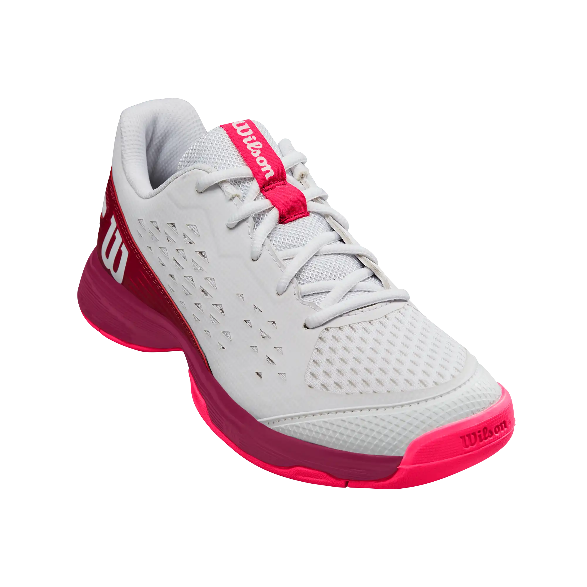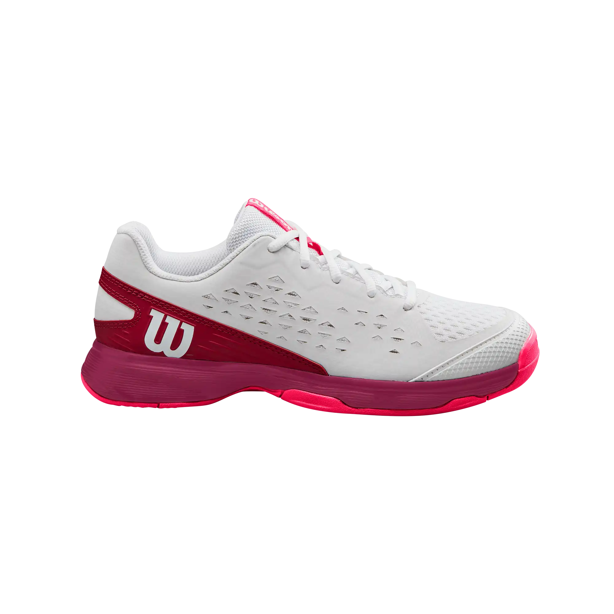 Keine Ablenkungen. Bleiben Sie auf dem Platz bequem mit dem Wilson Rush Pro Ace Jr. Diese Junior-Tennisschuhe eignen sich perfekt für warmes Wetter und sorgen mit ihrem atmungsaktiven Design dafür, dass Sie sich wohlfühlen. Die EVA-Zwischensohle sorgt für gepolsterten Halt und die strapazierfähige Außensohle sorgt für hohe Traktion auf jedem Untergrund.